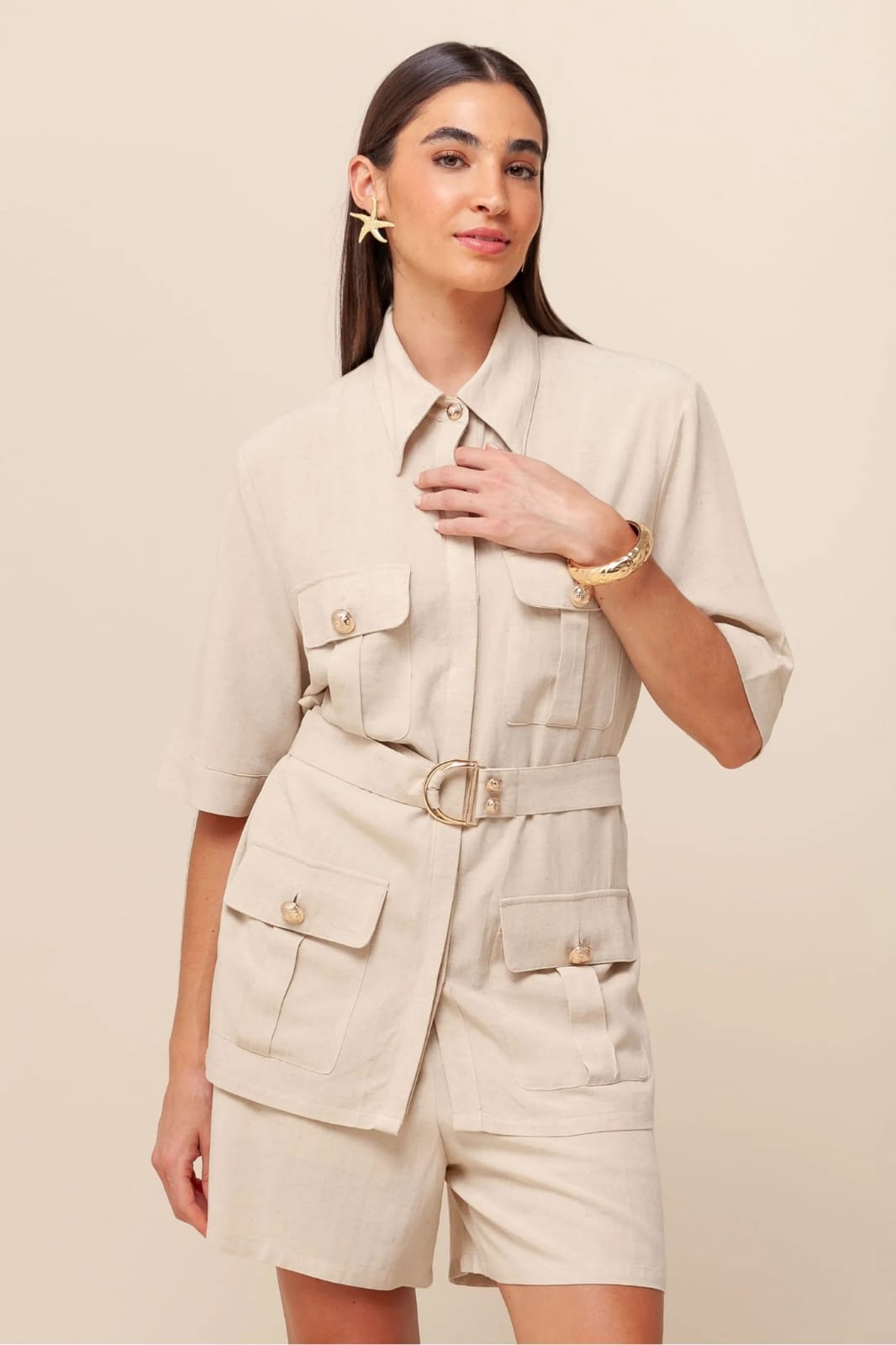 Camisa de manga curta 3/4, lapela dupla com fechamento por botões, quatro bolsos frontais utilitários e faixa com passante para cintura.