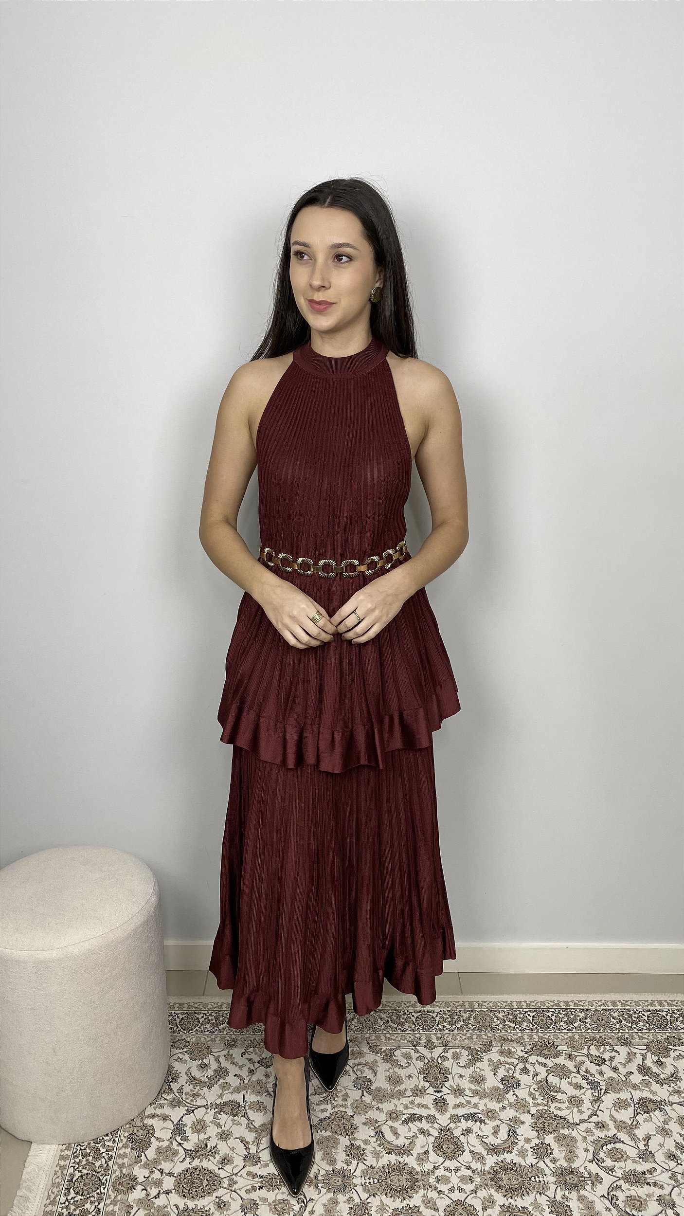 Descrição: Conjunto composto por 2 peças. Saia plissada midi, com barra dupla e cós com elástico embutido. Regata decote nadador com barra dupla.
