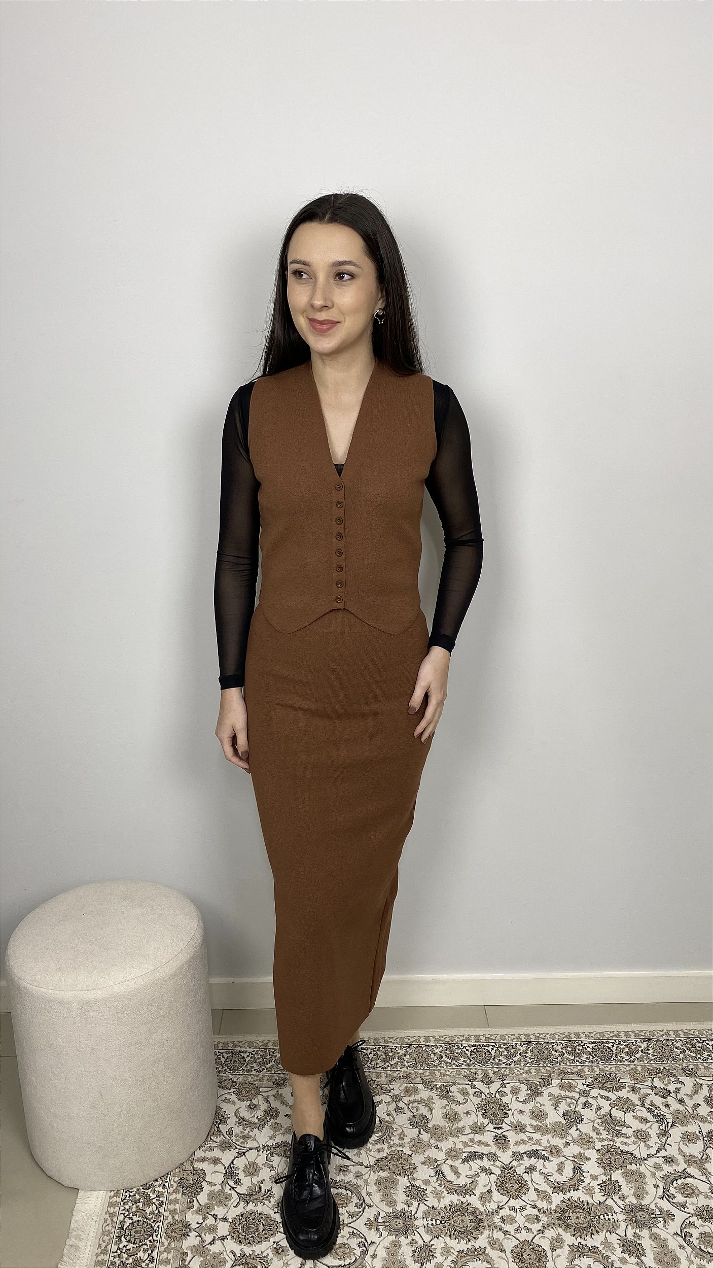 Descrição: Conjunto composto por 2 peças. Saia modelo lápis com fenda nas costas (a fenda pode ser usada na parte da frente, conforme sua preferência). Colete com fechamento por botões acrílicos. Ambas as peças são justas ao corpo.