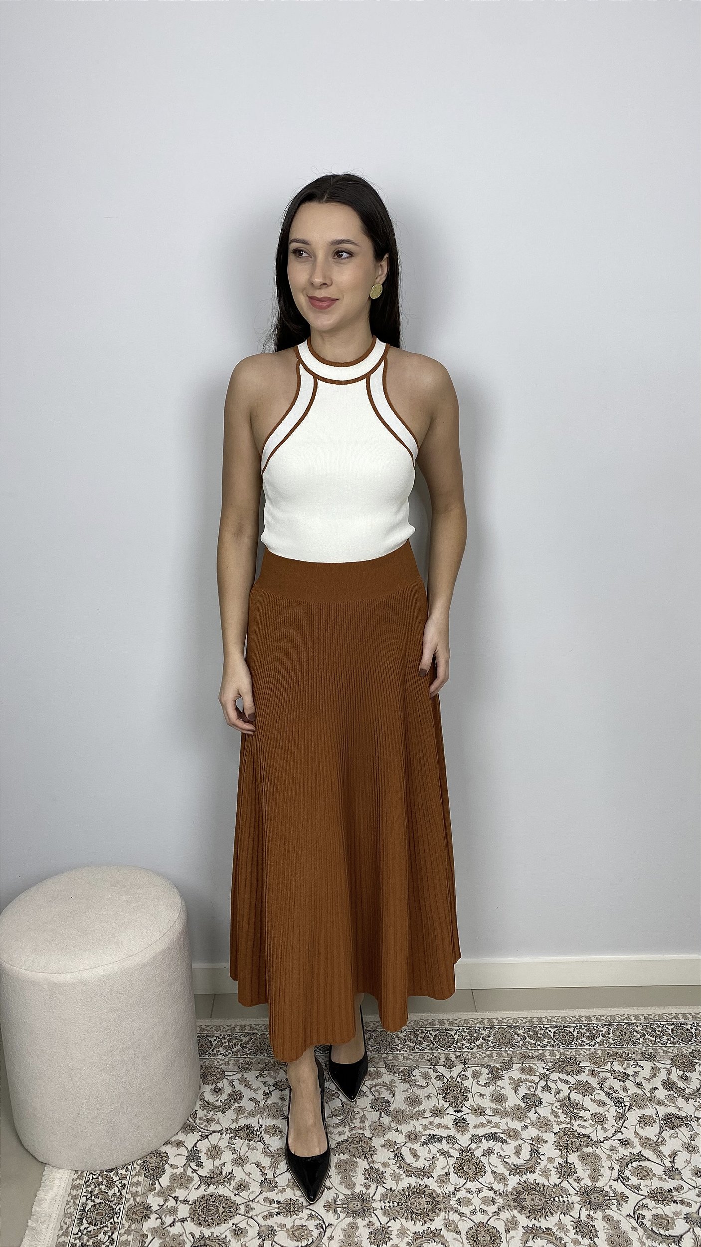 Saia midi plissada, modelo evasê. Confeccionada com fio de LYCRA .