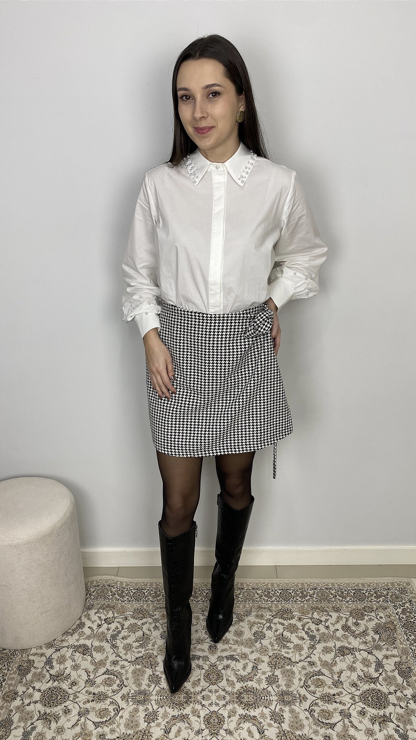 Descrição: Possui fechamento por zíper na lateral do short (parte interna), cós sem elástico e penses na parte de trás. Por cima do short, fixado em uma das laterais, tem uma sobreposição por toda circunferência da cintura dando origem a saia. Seu fechamento acontece ao amarrar os fios laterais. Estampa clássica.