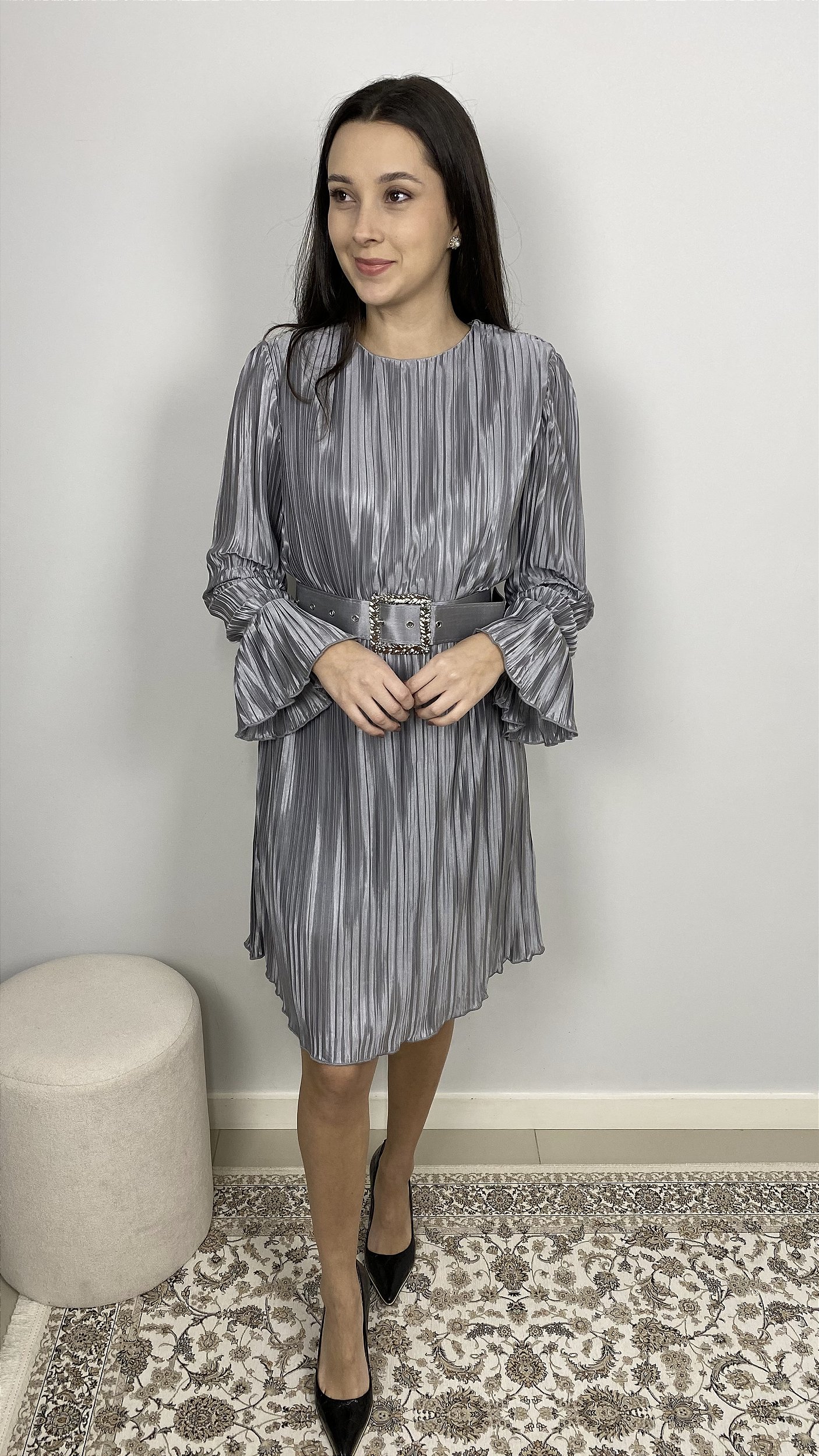 Descrição: Vestido de cetim plissado, manga longa, com punho evasê, comprimento na altura do joelho . O fechamento se dá através de botão nas costas. Acompanha cinto. Modelagem solta.