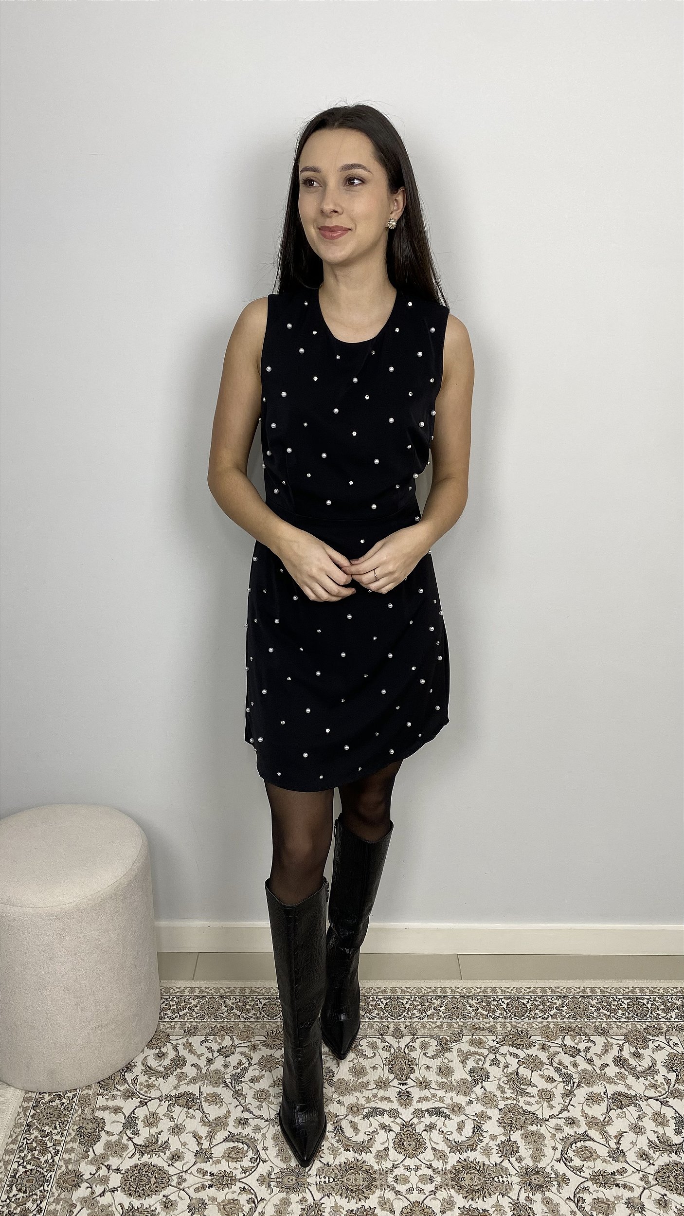 Descrição: Vestido modelo tubinho curto, com aplicações de strass. Recorte na cintura com penses, e penses no busto. Peça com caimento e toque leve, toda forrada. O fechamento se dá através de zíper no centro das costas.